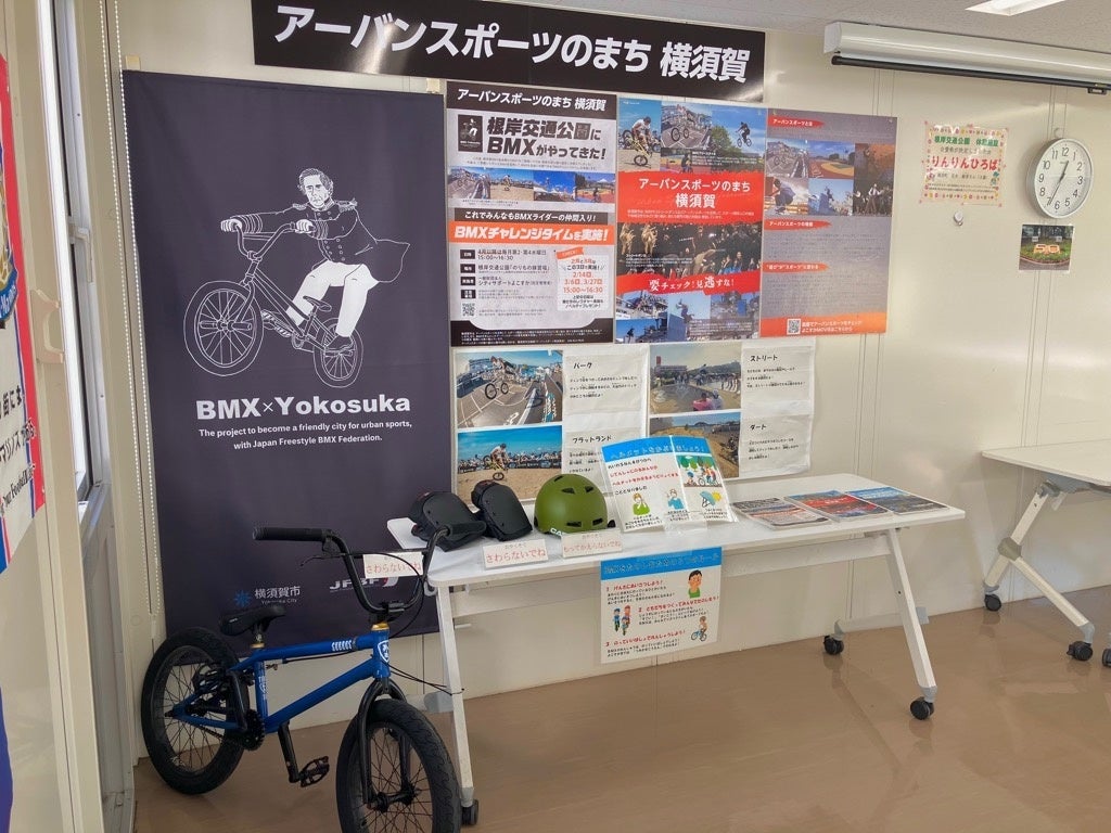 根岸公園内の屋内休憩所“りんりん広場”において、「BMXチャレンジタイム」の告知と、BMXの魅力紹介やヘルメット着用の啓発等のブースを設置しています。ぜひご家族で、根岸公園に遊びにお越しください!