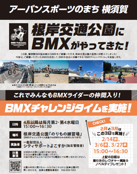 横須賀市はアーバンスポーツのまちとして、国際大会の開催や学校訪問、体験会などのBMX普及事業を行っておりますが、公園で定期的にBMXに乗れる機会を提供するのは、今回が初めての取り組みとなります。
