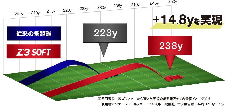 Z3 SOFT使用者124名を対象にしたアンケートでは、ボールを変えただけで平均14.8yもの飛距離アップ報告がありました。