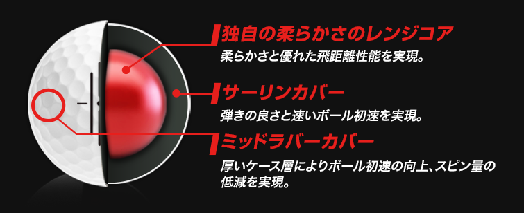 ボールは三層の構造からなる3ピース構造で、従来のボールよりさらなる性能を実現。