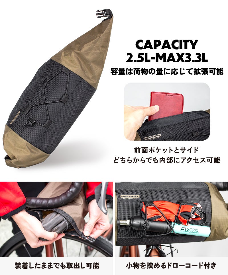 荷物の量に応じてロールして容量が拡張出来て、サイドから荷物を取出す事も可能なフロントバッグです。とても分厚く丈夫な1680Dナイロンで強く扱いやすく、バッグ前面はTPU防水撥水加工で雨や水を弾きます。
