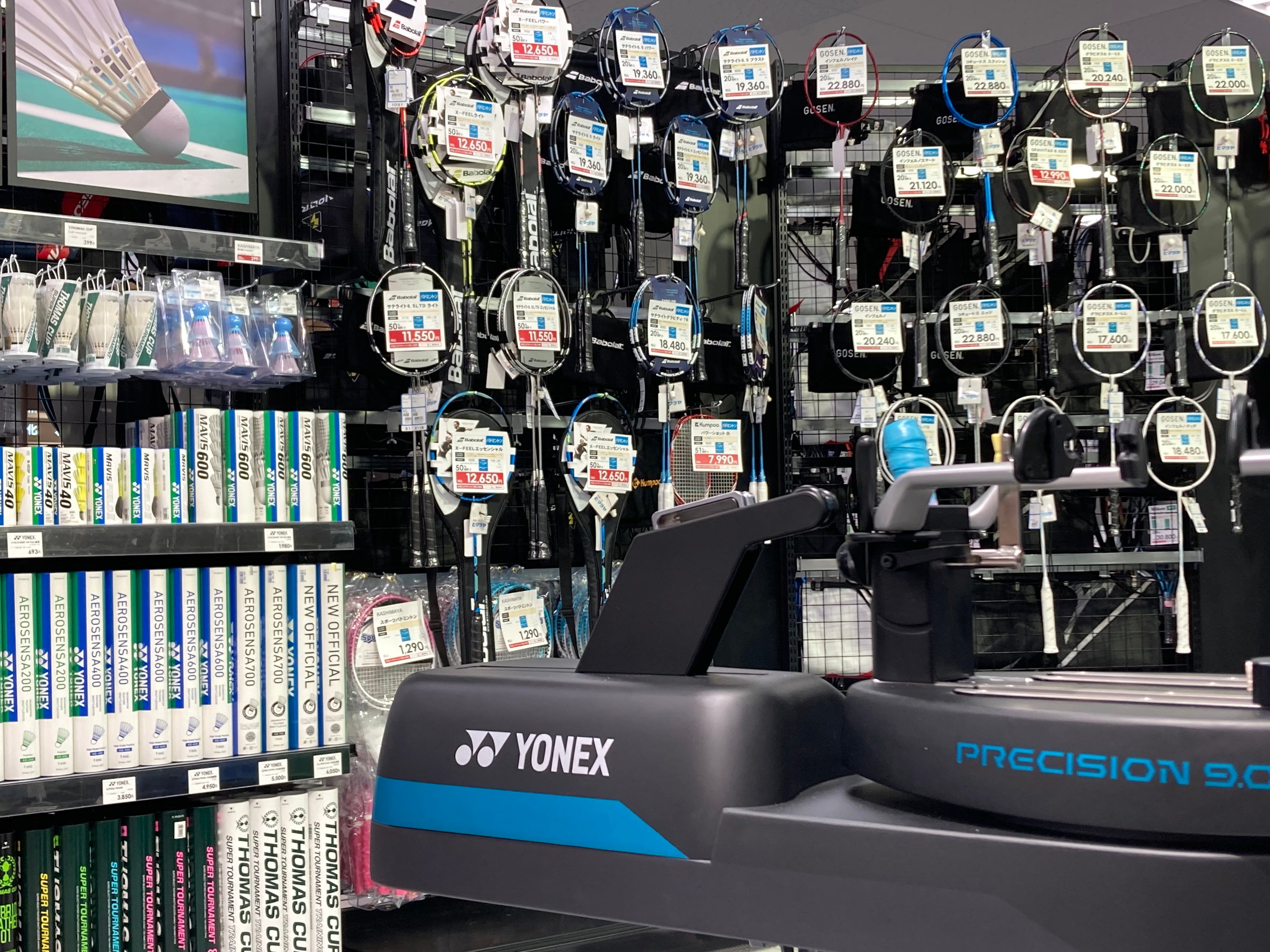 店頭では、ヒマラヤが誇る高いストリンギング技術を持ったスタッフが、ラケット・ガット選びから張り方まで、お客様一人ひとりを丁寧にサポートします。また、最新鋭のストリングマシンやスウィングウェイトマシンを常設。ヨネックス社のスウィングウェイトマシン「プレジションスキャン」は、ラケットを約5秒間置くだけで重量とバランス(重心)を同時計測できる優れもの。スタッフの知識に加え、数値にもとづいた比較により、数多くのラケットの中から最適な1本をお選びします。