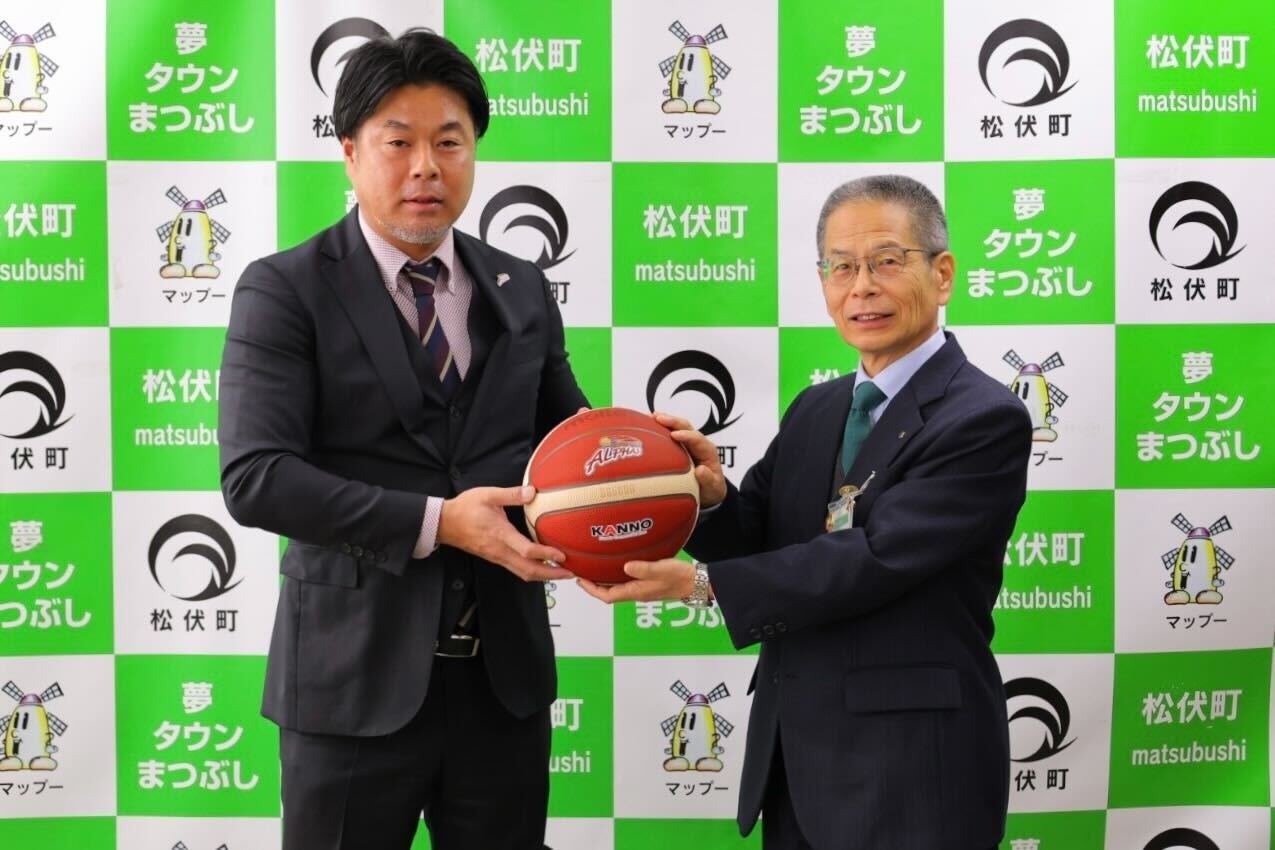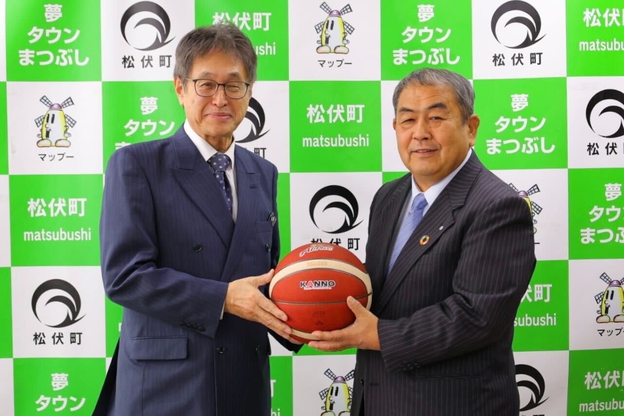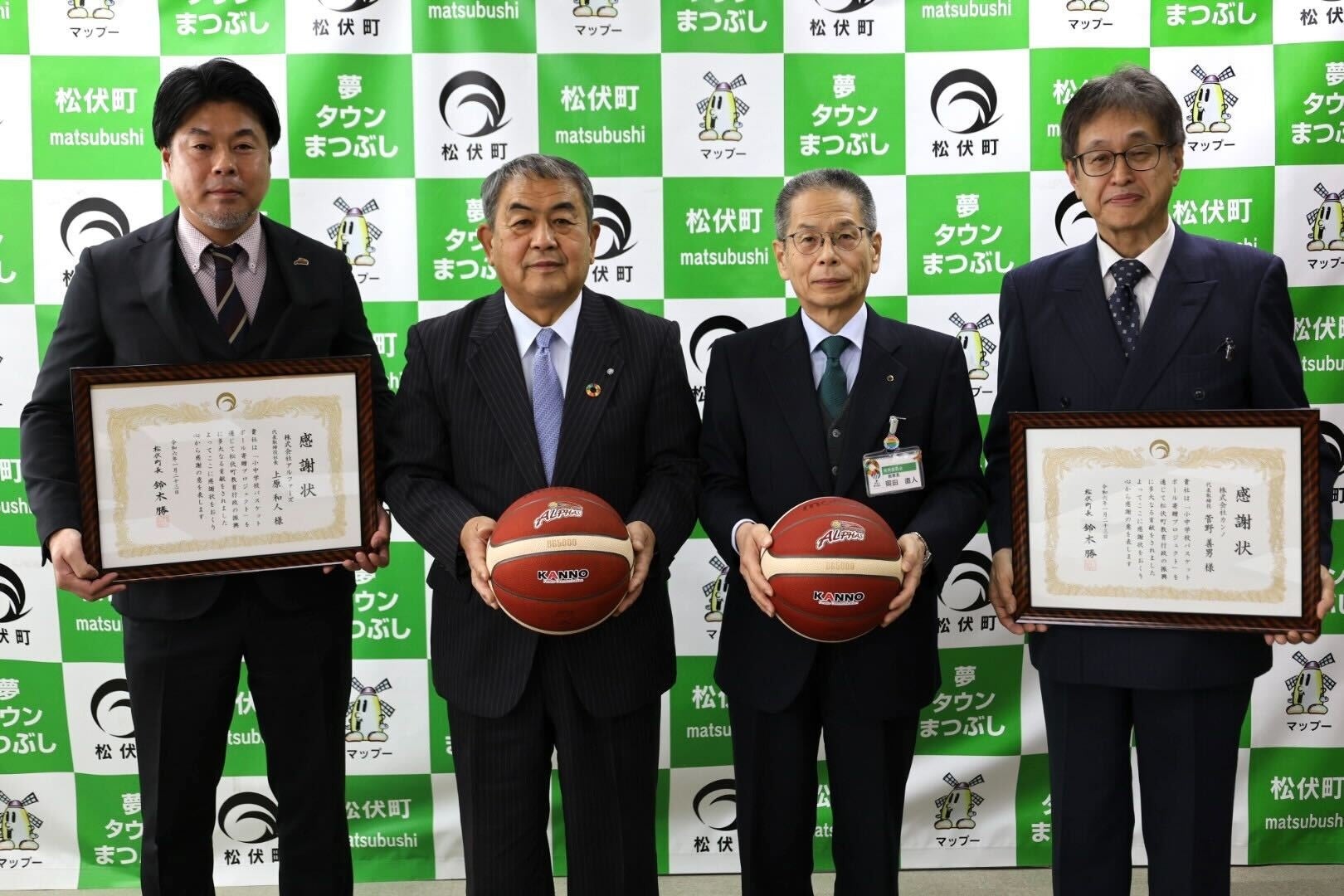 松伏町役場で行われた寄贈式では、ご協賛をいただいた株式会社カンノ代表取締役菅野善男様、関連会社の越谷アルファーズサポートカンパニー株式会社菅野福島商事代表取締役大塚節子様にもご出席いただき、松伏町の鈴木勝町長、岡田直人教育長にバスケットボールをお渡し致しました。