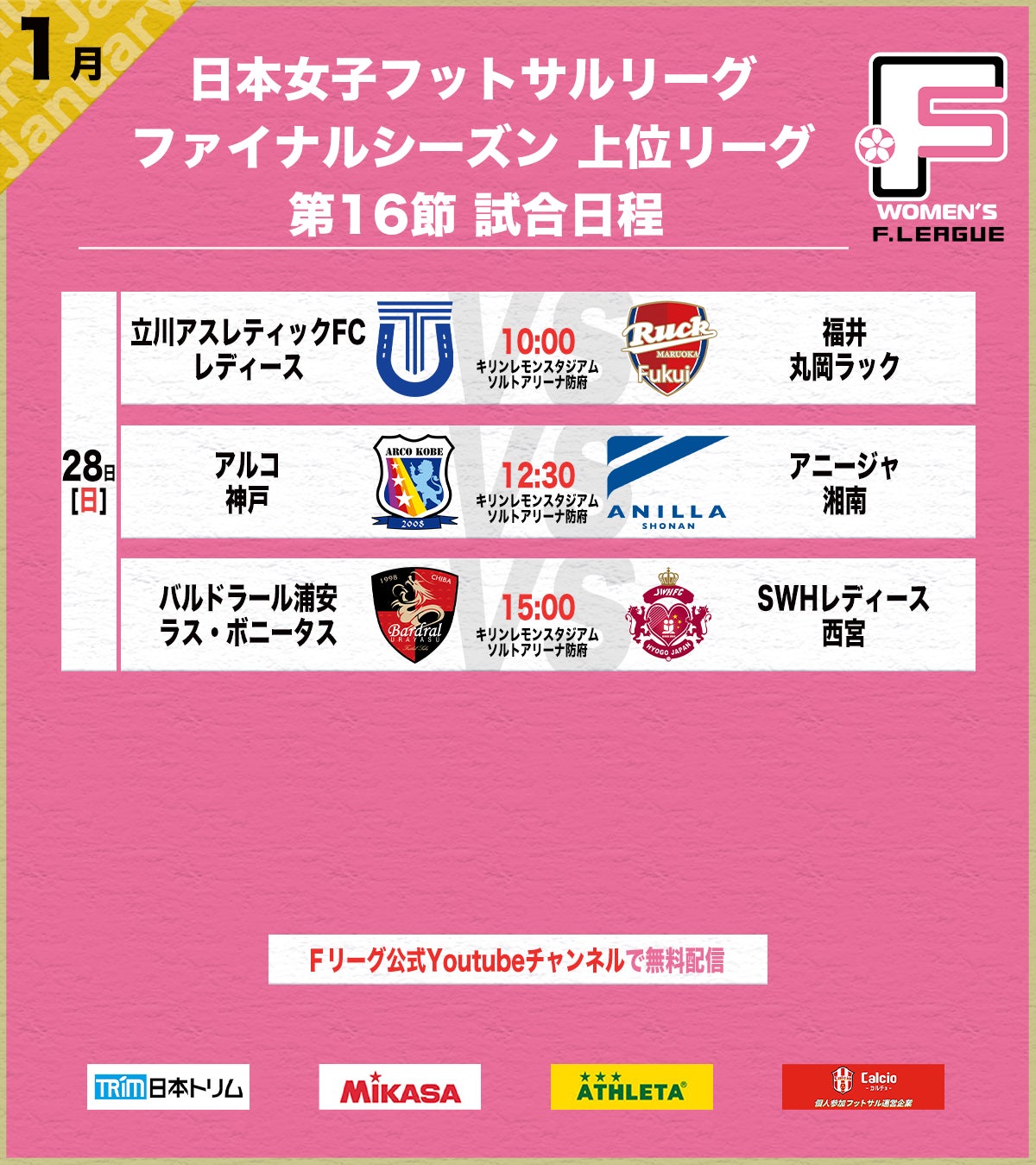 今週末は、ファイナルシーズン上位リーグ・下位リーグともに「キリンレモンスタジアムソルトアリーナ防府」で開催。全チームがリーグ戦最終戦となります。「最優秀選手賞」「ベスト5」「得点王」「敢闘賞」などシーズン個人タイトルの受賞者にも注目です。また、ホームアリーナでの開催となる宇部は、第14節では敗戦をしたものの点差はわずかに1と、チームに成長の兆しがうかがえました。今シーズン初勝利をあげることができるか注目です。今週末の試合も、Fリーグ公式Youtubeチャンネルで全試合をライブ配信いたします。ぜひご視聴ください!