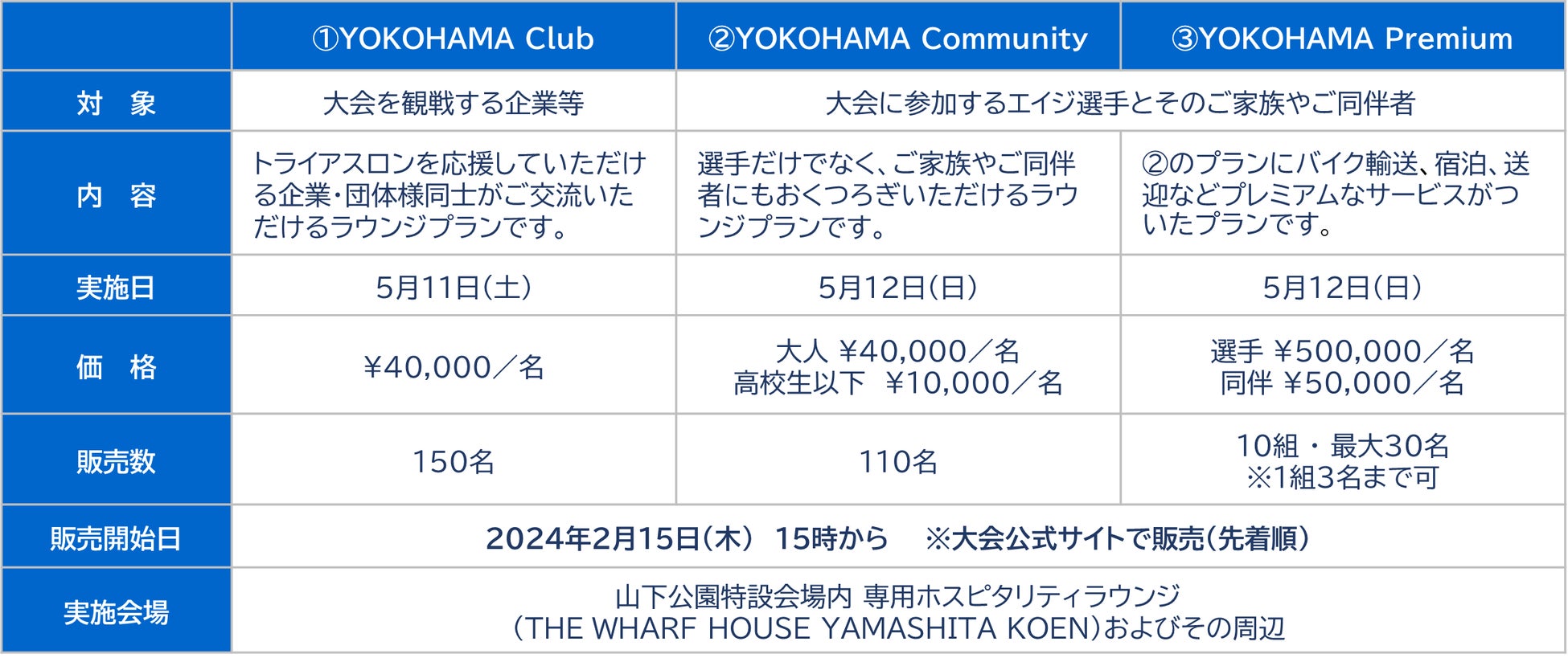 組織委員会とぴあ株式会社は、トライアスロンを応援していただける企業・団体や大会に参加するエイジ選手などにスポーツホスピタリティを提供し、普段とは違った特別な体験でトライアスロン・パラトライアスロンを楽しんでしていただくことで、横浜大会の価値向上を目指します。