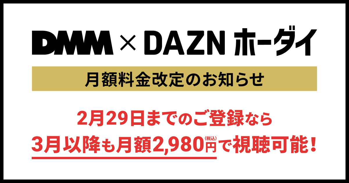 なお、2024年2月29日までに「DMM × DAZNホーダイ」をご登録いただいたお客様は、引き続き改定前の月額料金2,980円(税込)でお楽しみいただけます。