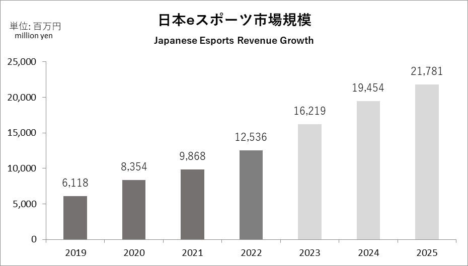 コロナ禍においてもオンライン開催の定着によって堅調に成長してきたeスポーツ市場は、2022年になって、徐々に増加してきたオフライン開催との相乗効果によって成長速度が加速。これまでの想定を超える勢いで拡大しました。この傾向は今後も続き、2025年に向けて市場規模は年平均20%を超える成長率で拡大することが見込まれています。