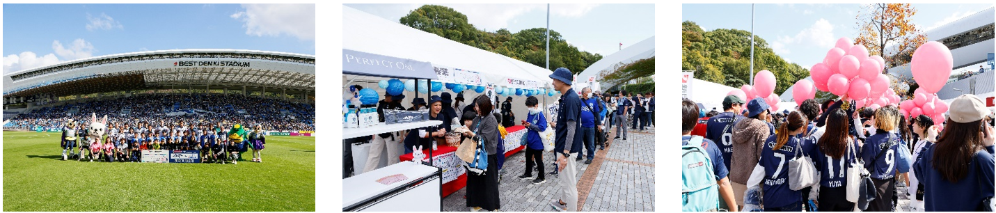 ピンクリボン啓発を大きなテーマとして、2023年10月28日横浜F・マリノス戦にて冠試合『PERFECT ONE DAY MATCH』を開催いたしました。2023シーズンも「新日本製薬商品の展示/抽選会ブース」出展、「ピンクリボン啓発/NPO法人ハッピーマンマ様とのコラボブース」出展、監督/選手のピンクリボン腕章着用での選手入場を実施し、2023シーズンは乳がん啓発イベントの新たな取り組みとしてバルーンリリースを実施しました。