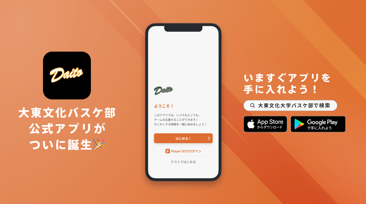 AppStoreもしくはGooglePlayで「大東文化大学男子バスケットボール部」と検索!