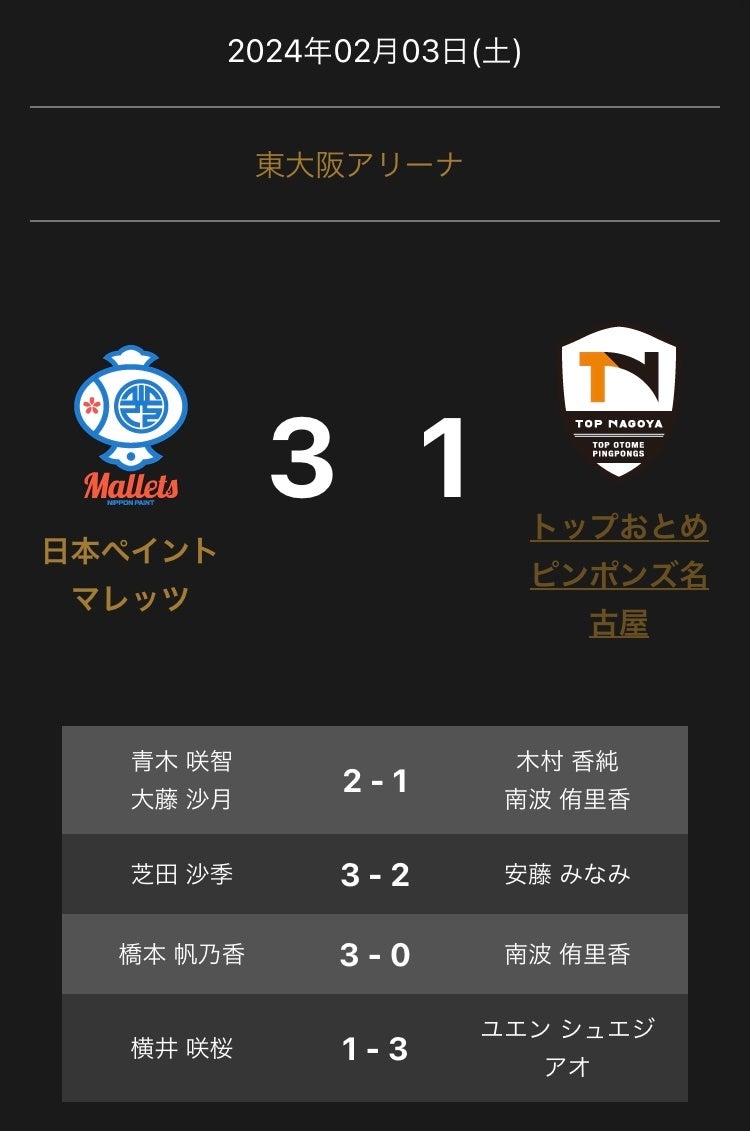 ホームプレスリリース ノジマTリーグ 2023-2024シーズン 公式戦 2月3日開催 日本ペイントマレッツvsトップおとめピンポンズ名古屋 試合結果 2024年02月03日 14時10分 公開|スポーツマニア編集部プレスリリース 一般社団法人Tリーグのプレスリリース 日本ペイントマレッツ対トップおとめピンポンズ名古屋の試合は、3-1で日本ペイントマレッツが勝利しました。