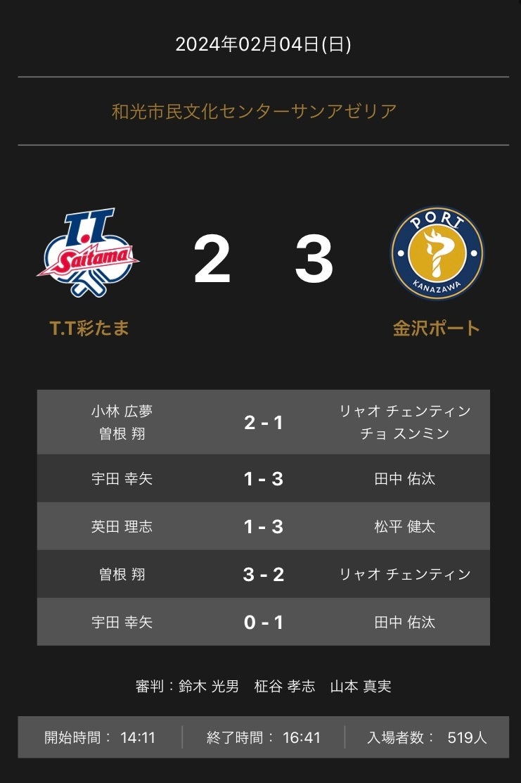 ホームプレスリリース ノジマ リーグ 2023-2024シーズン 公式戦 2月4日開催 T.T彩たまvs金沢ポート 試合結果 2024年02月04日 16時50分 公開|スポーツマニア編集部プレスリリース 一般社団法人Tリーグのプレスリリース T.T彩たまと金沢ポートの試合は、3-2で金沢ポートが勝利しました。