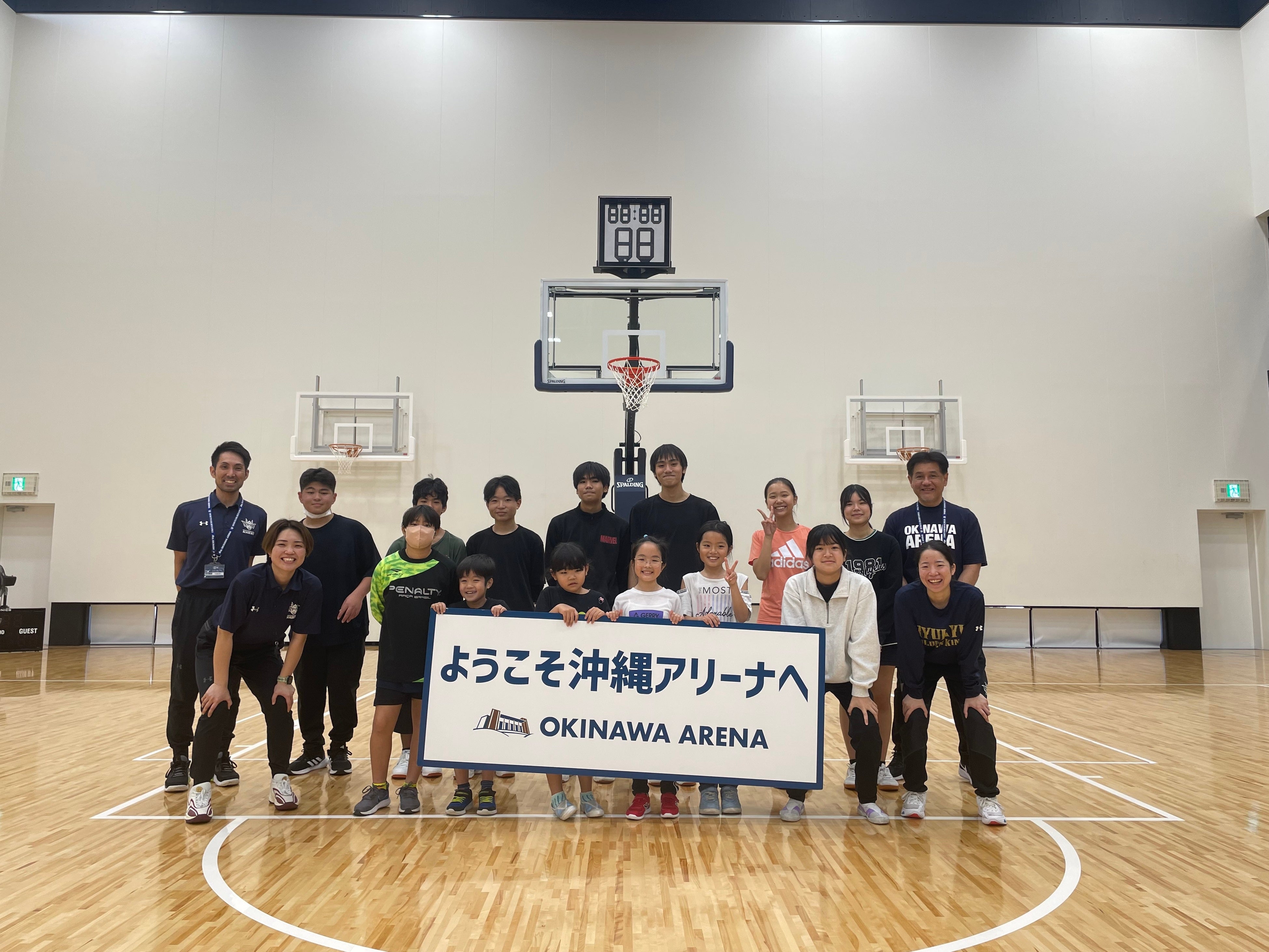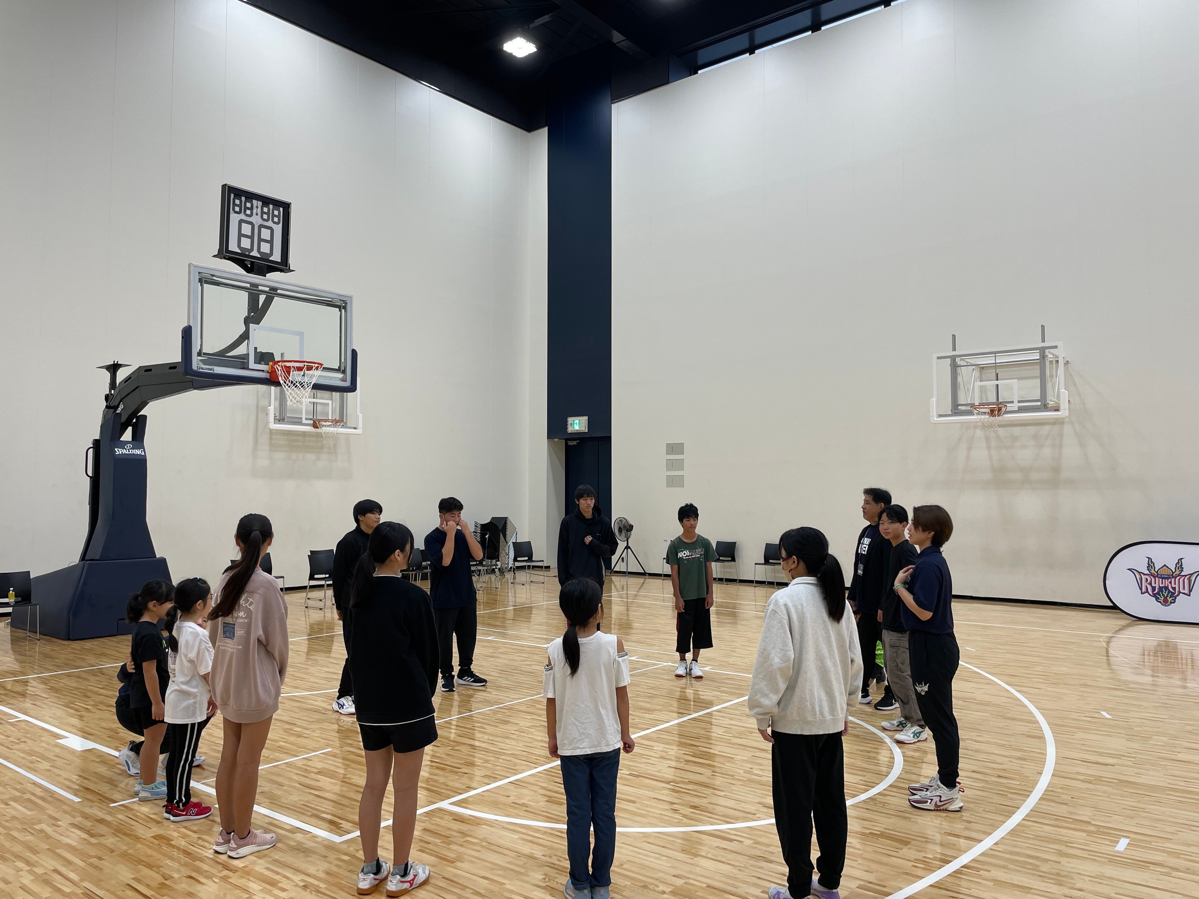 当日は「志塾フリースクールLINO」から小学生6名、中学生7名にご参加いただきました。また、沖縄スポーツアカデミー株式会社から与那嶺翼キングスU18ヘッドコーチとキングスアカデミーのコーチが指導にあたったほか、沖縄アリーナ株式会社からは伊禮勝智取締役が参加しました。