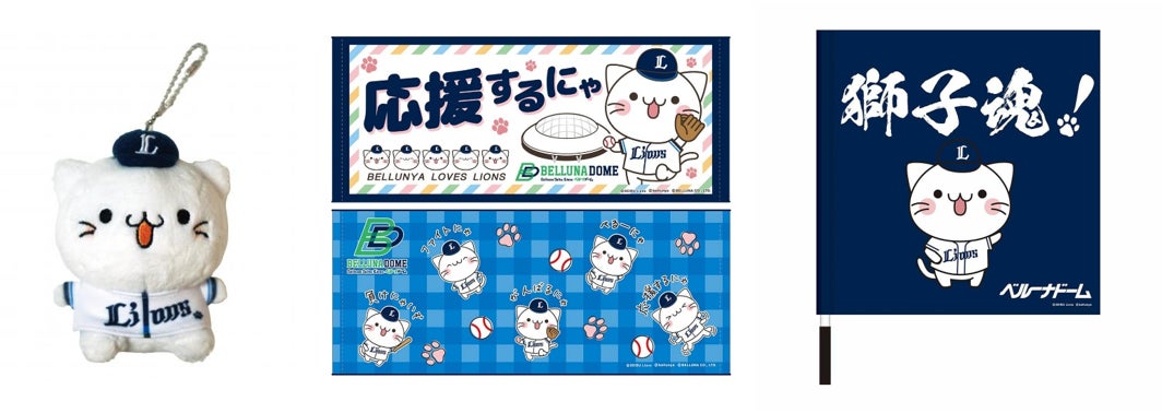 キーホルダーやタオル、フラッグなど、様々なアイテムでべるーにゃとライオンズのコラボグッズを制作・販売しています。試合観戦がより一層盛り上がること間違いなしのキュートな商品を多数展開しています。