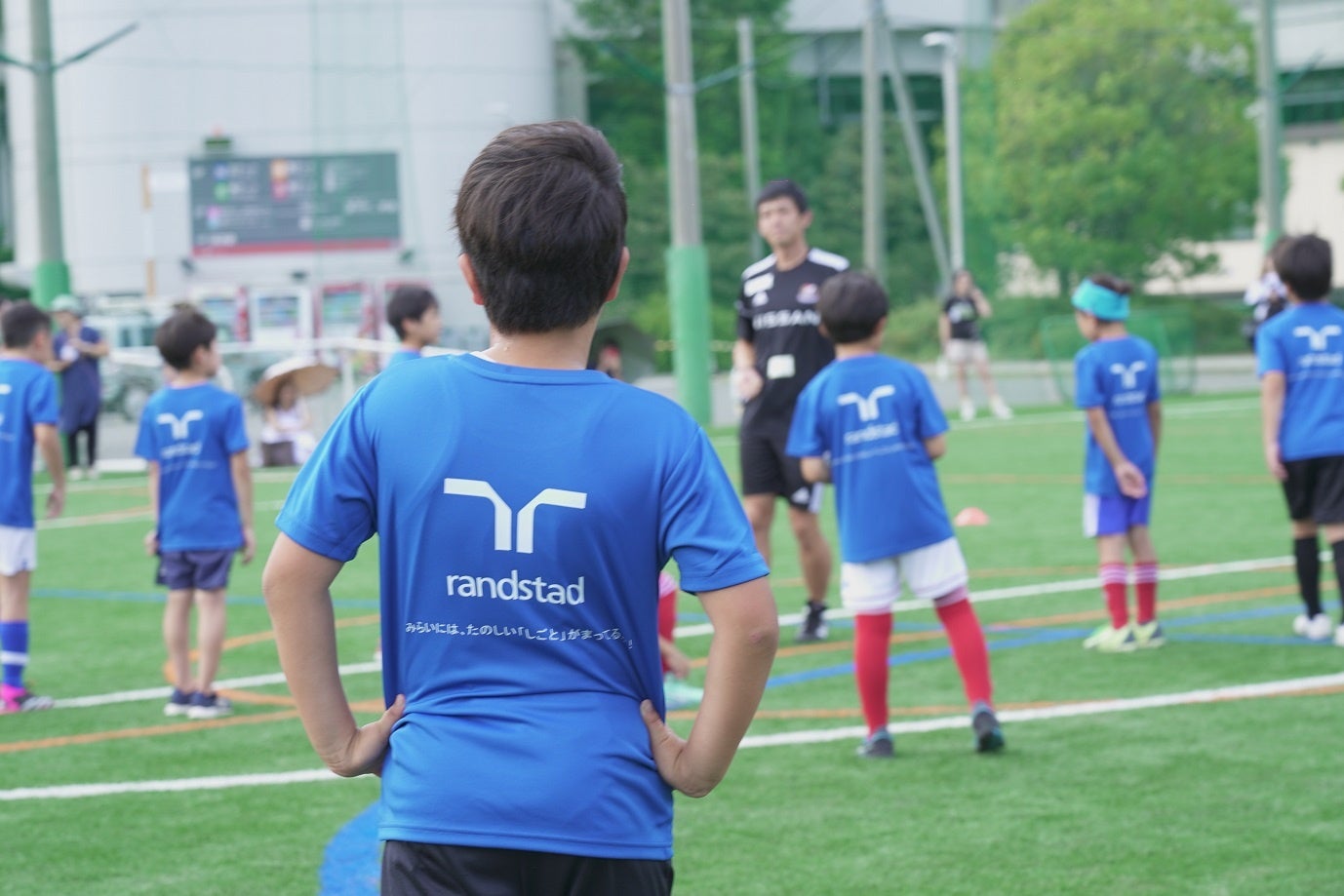 日産スタジアムとしんよこフットボールパークにおいて横浜F・マリノスの選手として1日を満喫する小学生向けのお仕事体験イベントを開催しました。当日は抽選で選ばれた50名の小学生が、F・マリノススポーツクラブのコーチや、元選手で横浜F・マリノス波戸康広アンバサダーの指導で元気いっぱいにサッカー選手としての1日を過ごしました。またランスタッドからは選手のほかにもサッカーを支える沢山のお仕事があることを紹介し、多様な人たちがそれぞれの個性や特技を生かして社会に貢献していることを伝えました。
