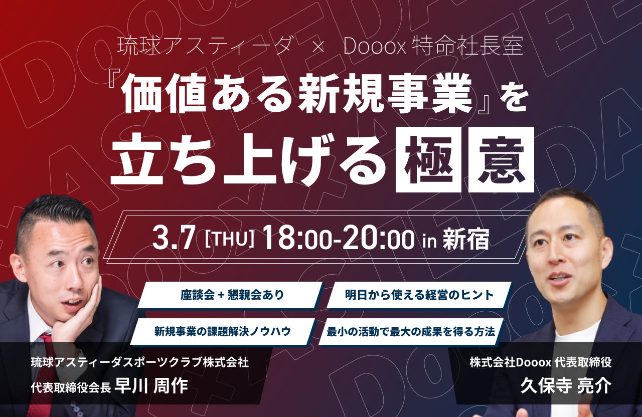 “行動で世の中を変えていく“を理念に掲げる株式会社Dooox(本社:東京都千代田区、代表:久保寺亮介/以下「当社」)は経営者の皆様の交流の場として、第二回交流会「Dooox会」を都内で開催します。今回はスペシャルゲストをお呼びし、座談会×交流会形式で”新規事業立ち上げの極意”に迫ります。エントリーはこちらから:https://forms.gle/VQxHVd3tR5F4U4JJ9