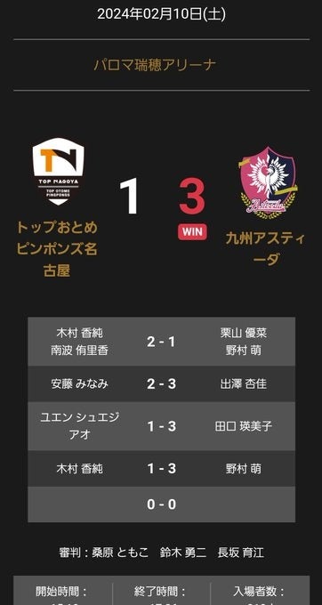 ホームプレスリリース ノジマTリーグ 2023-2024シーズン 公式戦 2月10日開催 トップおとめピンポンズ名古屋vs 九州アスティーダ 試合結果 2024年02月10日 18時00分 公開|スポーツマニア編集部プレスリリース 一般社団法人Tリーグのプレスリリース ノジマTリーグ 2023-2024シーズン 公式戦 2月10日開催 パロマ瑞穂アリーナ トップおとめピンポンズ名古屋vs 九州アスティーダ 3-1で九州アスティーダが勝利しました