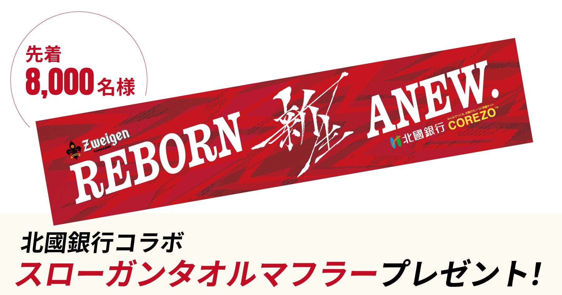 今季のツエーゲン金沢のスローガンは「新生」!文字通り、「新たに生まれ変わる」気概と決意をもって、J2昇格に挑みます。この「新生」のロゴと今季のユニフォーム柄を使用した真っ赤なタオルマフラーを先着8,000名様にプレゼント!