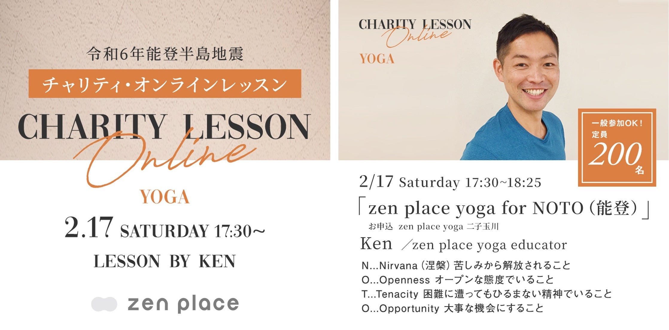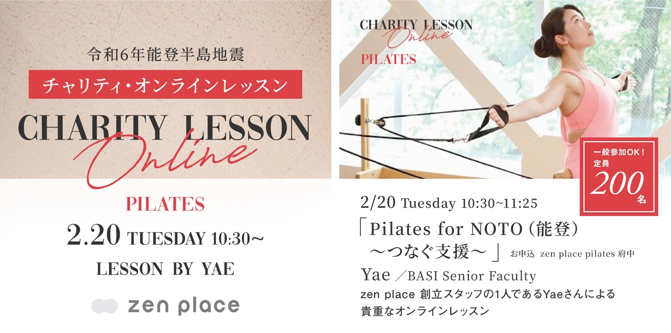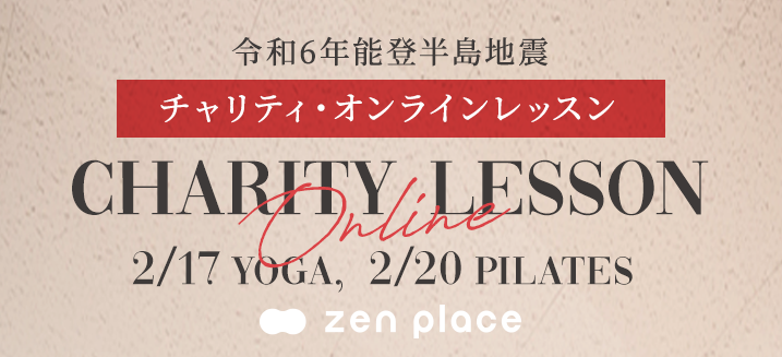 また、zen place ピラティス・ヨガスタジオでは参加料を被災地に寄贈する各種チャリティ・レッスンを開催、2024年2月17日(土)と2月20日(火)はどなたでも参加いただけるヨガ・ピラティスのオンラインレッスンを開催いたします。