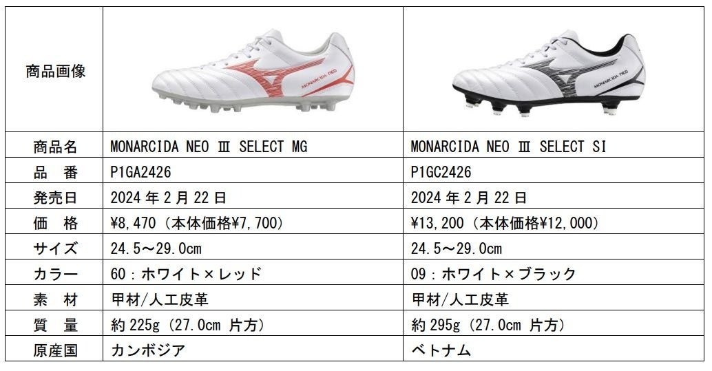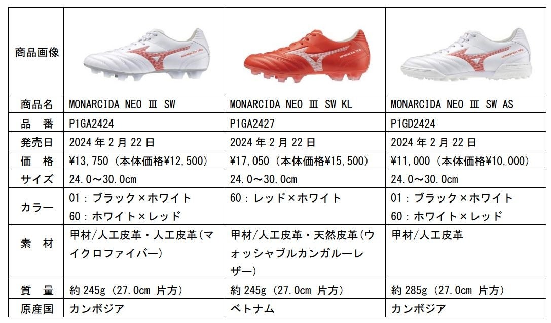 また、プレーヤーからの意見をもとに、天然皮革でワイド(3E)タイプの「MONARCIDA NEO Ⅲ WIDE PRO」、取替式ソールの「MONARCIDA NEO Ⅲ PRO MIX」、マルチなグラウンドでも使用可能で、より足への負担を考慮したアウトソールを搭載した「MONARCIDA NEO Ⅲ SELECT MG」を新たにラインナップし、「MONARCIDA NEO Ⅱ」シリーズから4モデル拡大しました。多くのプレーヤーが選択しやすいように幅広い価格帯や足幅も2Eから4Eまで取り揃え、キッズモデルからトレーニング用、取替式シューズなど含め、計18モデルを展開します。