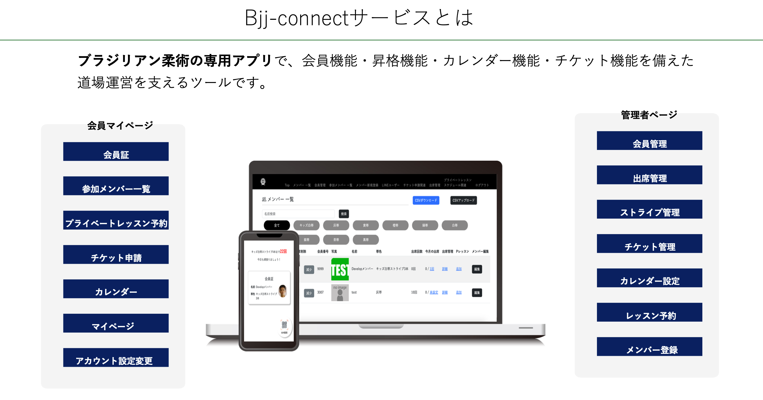 Bjj-Connectは、ブラジリアン柔術に特化した、会員管理、ストライプ管理(昇格管理)、カレンダー管理、チケット管理などを兼ね備えたWebアプリケーションです。このアプリは、道場の日常運営を簡素化し、効率化することおよび会員の継続率を上げることが可能なサービスとなっております。
