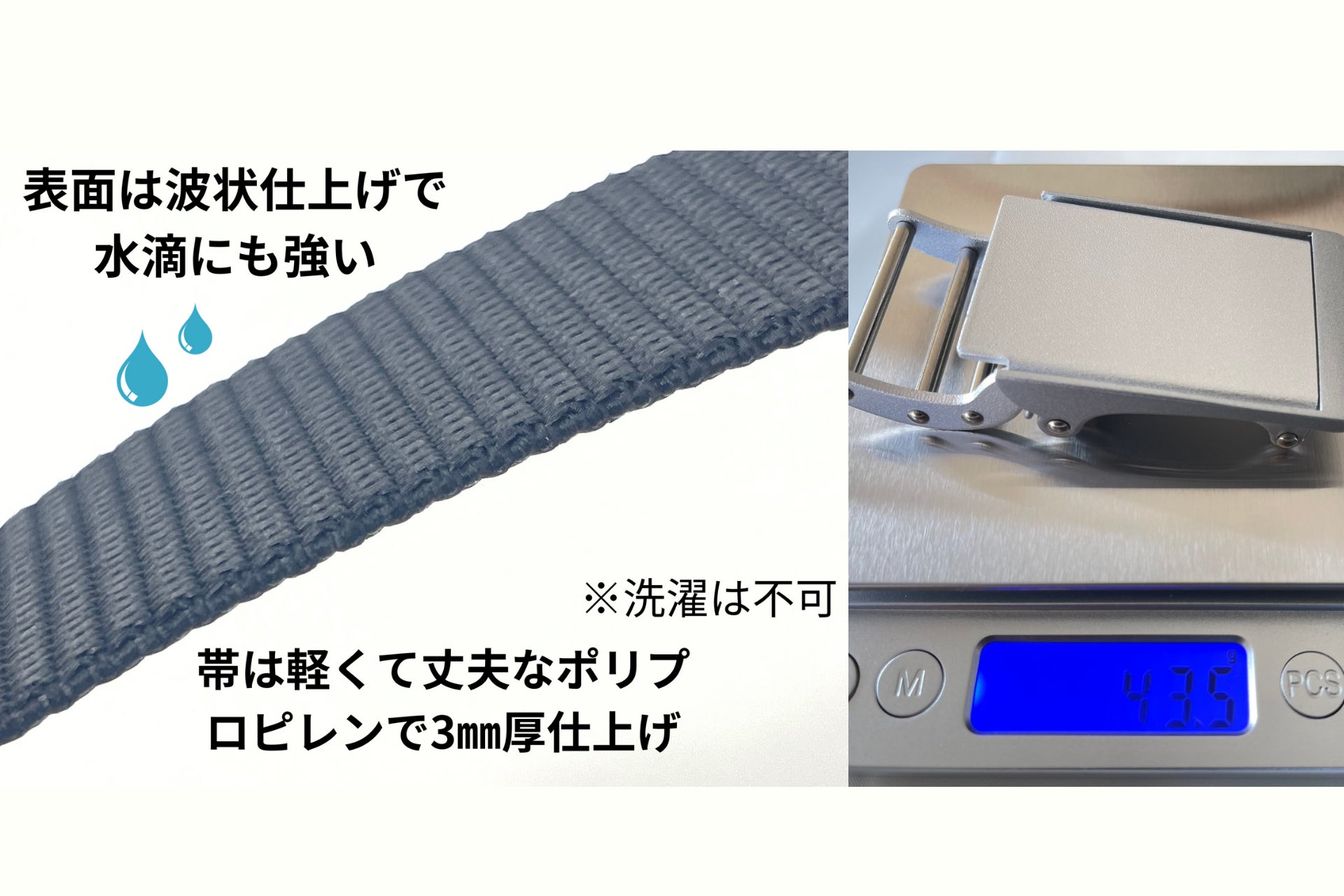 ベルト帯は軽くて丈夫なポリプロピレンを使用し、波状にすることで、水滴にも強い仕様に。バックルは超軽量のアルミバックルを使用することで、ベルトの重さ約100gを実現しました。