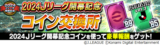 期間中手に入れた「2024Jリーグ開幕記念コイン」を使って「お気に入りクラブG85以上レギュラー2023 vol.2ガチャ券」や「G89以上ガチャ券」などのアイテムと交換できます。