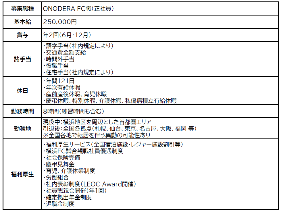 当日のセレクションはゲーム形式で実施。合格者は後日、書類選考と面接(複数回)を経て内定という流れになります。2025年度採用者は15名を目標としており、いずれも正社員としてONODERA GROUP各社へ配属を予定。横浜FCとの連携を活かした練習環境で、アマチュア最高峰の「なでしこリーグ」昇格を目指すアスリートとしてデュアルキャリアを歩むことになります。