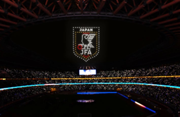 オリンピック出場を懸けたチームを後押しするべく、選手入場前に国立競技場上空へドローンを放ち、日本代表エンブレムをはじめとした様々なシルエットがスタジアム上空の夜空を彩ります。