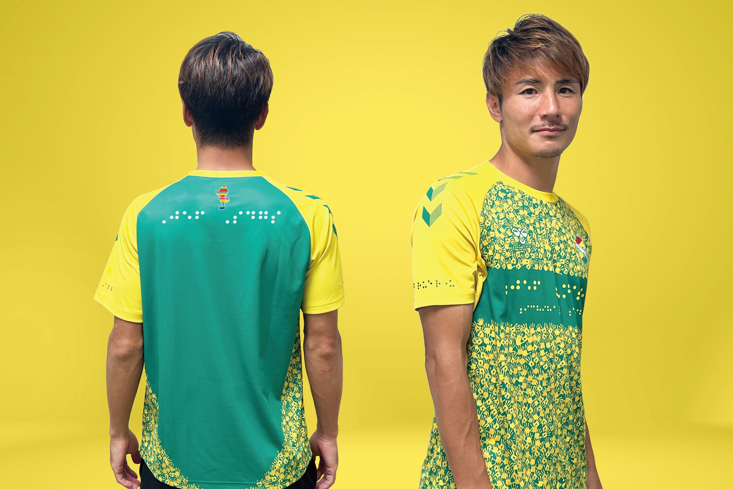 明治安田生命J2リーグ第36節となった9月23日には、選手がウォーミングアップや入場時に点字シャツを着用。デザインは、たくさんの応援する手のひらを重ね、スタジアムに喜びをつくり出す様子を全面にプリント。