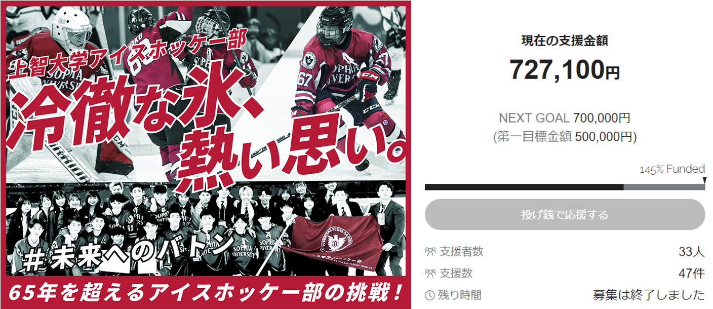 1.上智大学アイスホッケー部「冷徹な氷、熱い思い。65年を超えるアイスホッケー部の挑戦」プロジェクト、目標金額50万円達成!