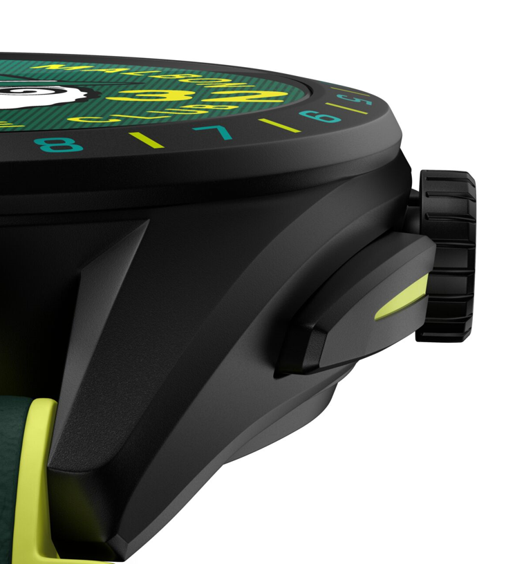 Malbon Golfのブランドを思わせるターコイズブルーとイエローの色彩がウォッチの側面、プッシャー、リューズを彩るデザインは、一際目を引きます。ラバーとカーフレザーを合わせたストラップに取り入れたのは明るいイエローとグリーン。コラボレーションをさりげなく強調し、鮮やかなアクセントとなっています。