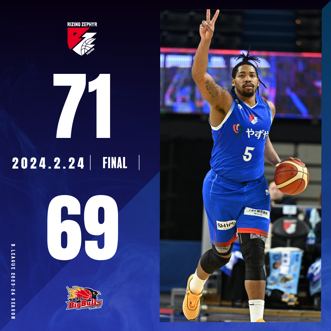 2024年2月24日(土)に開催されました【ライジングゼファーフクオカvs.岩手ビッグブルズ】において“福岡71-69岩手”の結果となりましたことお知らせいたします。