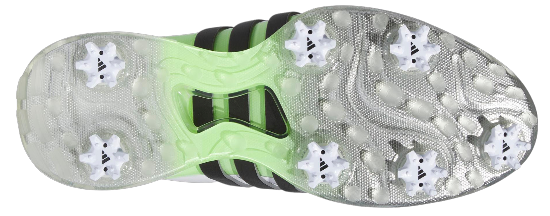 アウトソールには、スイング時にゴルファーが求める高い安定感を確保しながら、歩行時の突き上げ感を感じにくい構造の7つのクリートを搭載。クリートは、ツアーアスリートの力強いスイングを十分に支える安定性を発揮するよう、足裏の外側を1周するように設置し安定性を向上しました。また、歩行時の快適性を確保するため、柔軟に屈曲させたい箇所とその方向にのみ、溝のような「フレックスグルーブ」を配置。溝の中に地面との摩擦によってグリップ力を生むスパイクレスラグ(凹凸)を配することによって、柔軟性とグリップ力を両立させています。