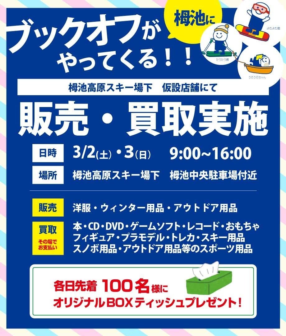 大会期間の3月2日(土)、3日(日)には、栂池中央駐車場付近で本や、CD・DVD、おもちゃ、スポーツ用品など様々な商品の販売・買取を行うブックオフ仮設店舗を出店します。各日先着100名様にオリジナルティッシュBOXをプレゼントいたします。