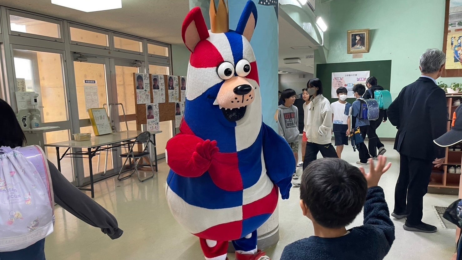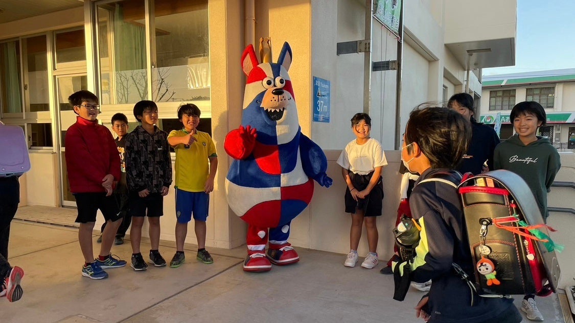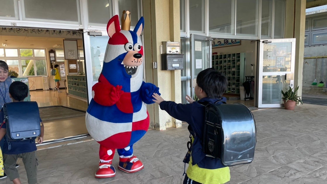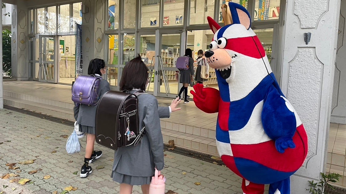 冬の寒さが少し残りつつも清々しい風が心地よい朝の時間に、元気よく登校してくる子どもたちへゴーディーも元気いっぱいの挨拶を交わしました。