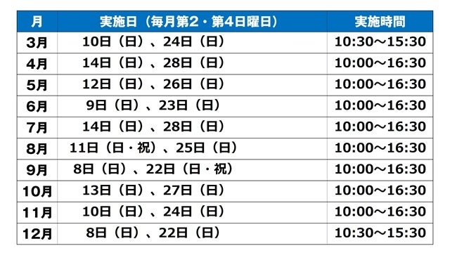 毎月第2、第4日曜日(4~11月は10:00~16:30、12~3月は10:30~15:30)