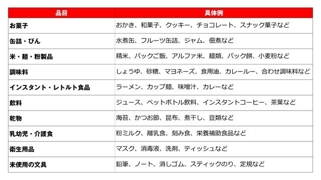 A4.お菓子や缶詰・びん、お米などの食料品のほか、衛生用品や未使用の文具などです。日常生活の中で、みなさんが使われている多くのものが該当します。