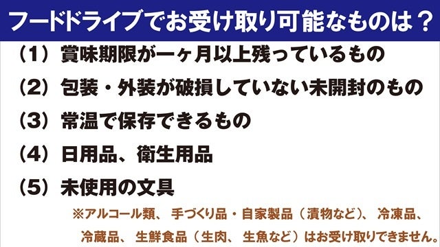A5.食料品1点のご寄付からご参加いただけるのが、フードドライブです。決してご無理なく、ご家庭で備蓄されている食料品や日用品を定期的に確認されまして、お預けいただけるものがございましたら、お持ちよりください。