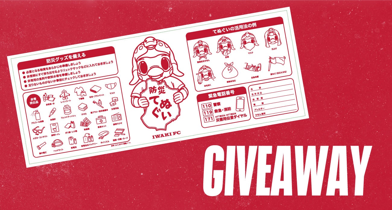 災害時の備えや手ぬぐいの活用方法など役立つ情報がデザインされたいわきFCオリジナルの防災啓発グッズを先着3,000名様にプレゼント!