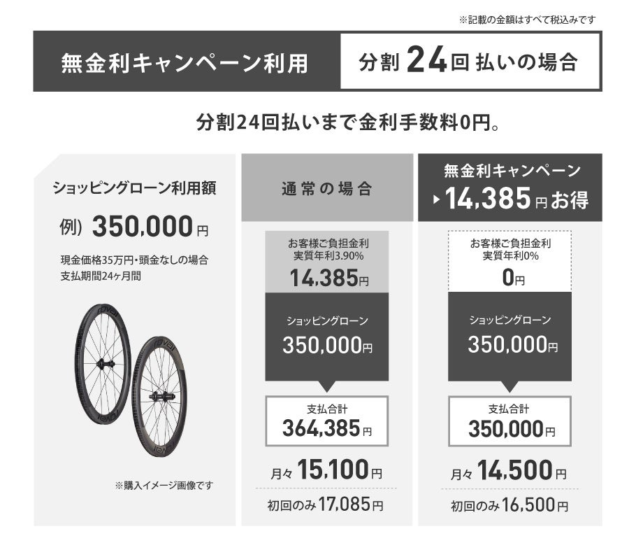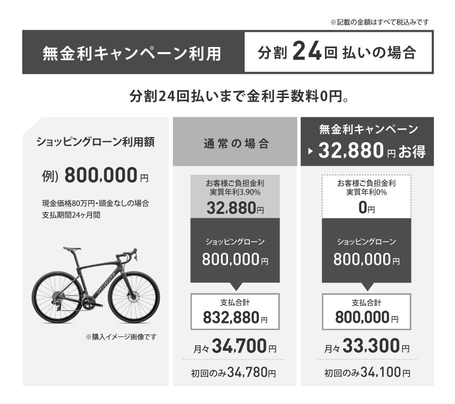 一括でのお支払いと同じ総支払額(24回までの分割払いの場合)で手元に現金を残しながら、計画的にサイクリングライフを楽むスタイルをこの機会にお試しください。
