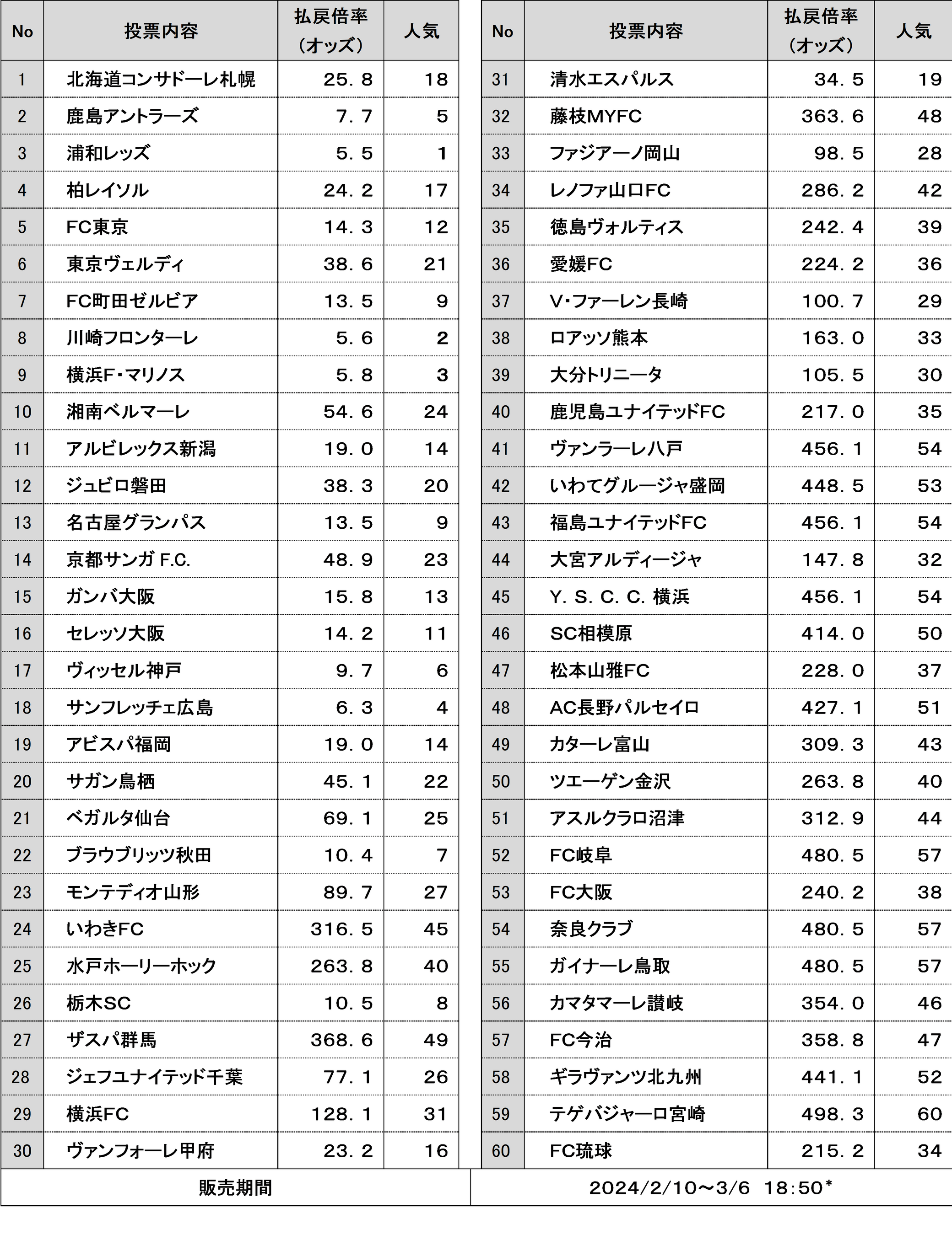 ※3 3月5日(火)10時時点の投票状況となります。払戻倍率(オッズ)は、投票状況により販売終了まで変動します。払戻倍率(オッズ)は、スポーツくじオフィシャルサイト(https://www.toto-dream.com/)で随時更新しています。