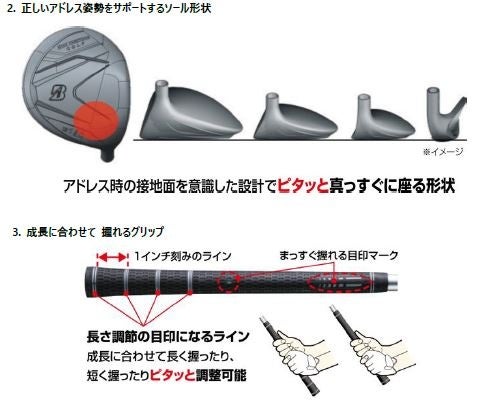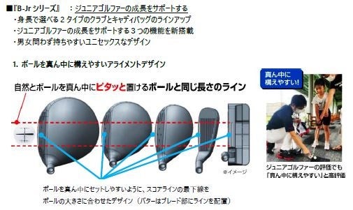 『B-Jrシリーズ』は、ユニセックスなクラブデザインで、ボールを真ん中に構えられるアライメントデザインや、正しいアドレス姿勢をサポートするソール形状、成長に合わせて握りやすい設計のグリップなど、ジュニアゴルファーの成長に寄り添った機能を搭載しています。商品は、身長で選べる2タイプ(Type130/Type150)のクラブとキャディバッグをラインアップしています。