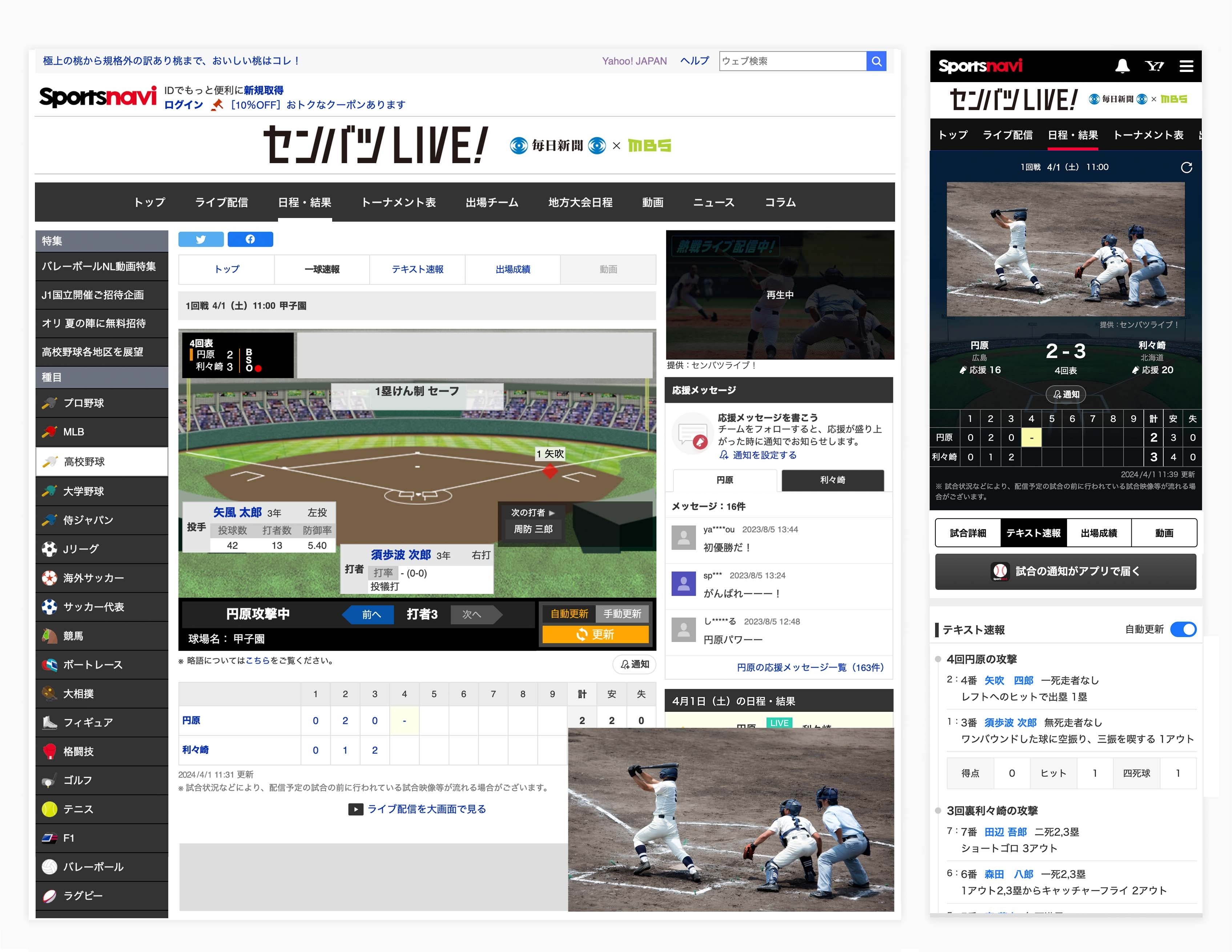 「スポーツナビ」(ブラウザー版、アプリ版)では、組み合わせ抽選会と大会期間中の全31試合のライブ配信のほか、熱戦のダイジェスト、注目プレーのハイライト、1試合丸ごと、勝利監督・選手インタビューなど、球児の姿に迫る魅力ある動画も盛りだくさんでお届けします。「スポナビ 野球速報アプリ」からも、「センバツLIVE!」に簡単にアクセスできます。また、応援する学校の情報が届くフォロー機能、応援メッセージの投稿機能も搭載し、臨場感のある観戦体験をお届けします。