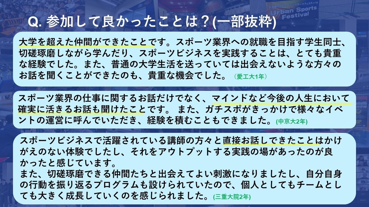 『ガチスポ』は、スポーツ産業の拡大に向けた人材育成を目的としています。学生たちがスポーツビジネスを学び視野を広げることで、将来スポーツ産業を担う人材となるきっかけになり、スポーツ産業がより振興するための一翼を担うことを目指します。
