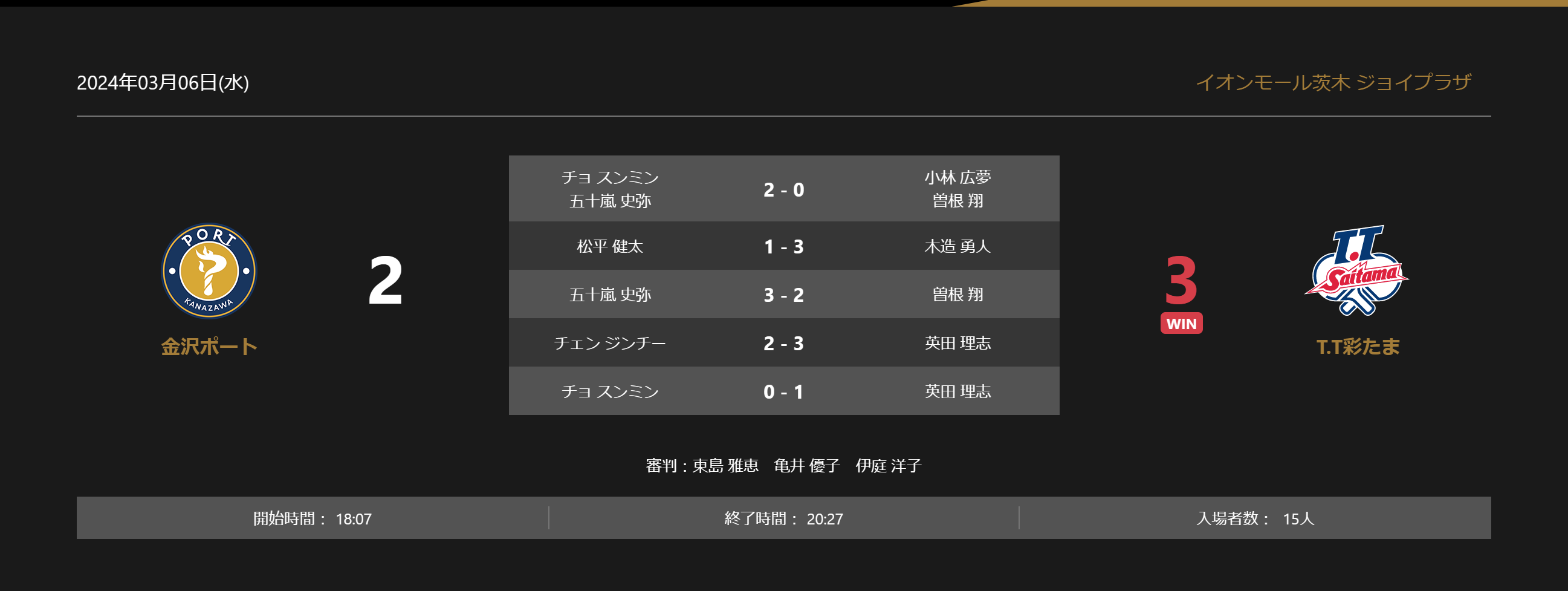 ホームプレスリリース ノジマTリーグ 2023-2024シーズン 公式戦 3月6日開催 金沢ポート vs TT.彩たま 試合結果 2024年03月06日 21時30分 公開|スポーツマニア編集部プレスリリース 一般社団法人Tリーグのプレスリリース ノジマTリーグ 2023-2024シーズン 公式戦 3月6日開催の「金沢ポート vs TT.彩たま」の試合は、3-2でTT.彩たまが勝利しました。