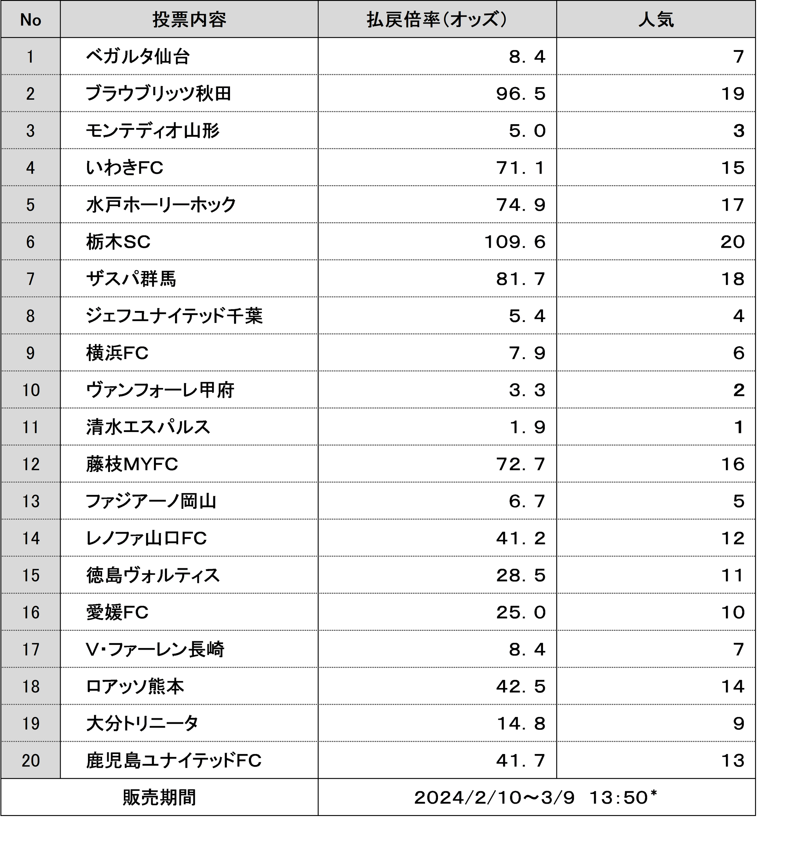 1番人気は、昨シーズン4位の清水エスパルスで、払戻倍率(オッズ)は1.9倍!2番人気は、昨シーズン8位のヴァンフォーレ甲府で、払戻倍率(オッズ)は3.3倍、3番人気は、昨シーズン5位のモンテディオ山形で、払戻倍率(オッズ)は5.0倍となっています。
