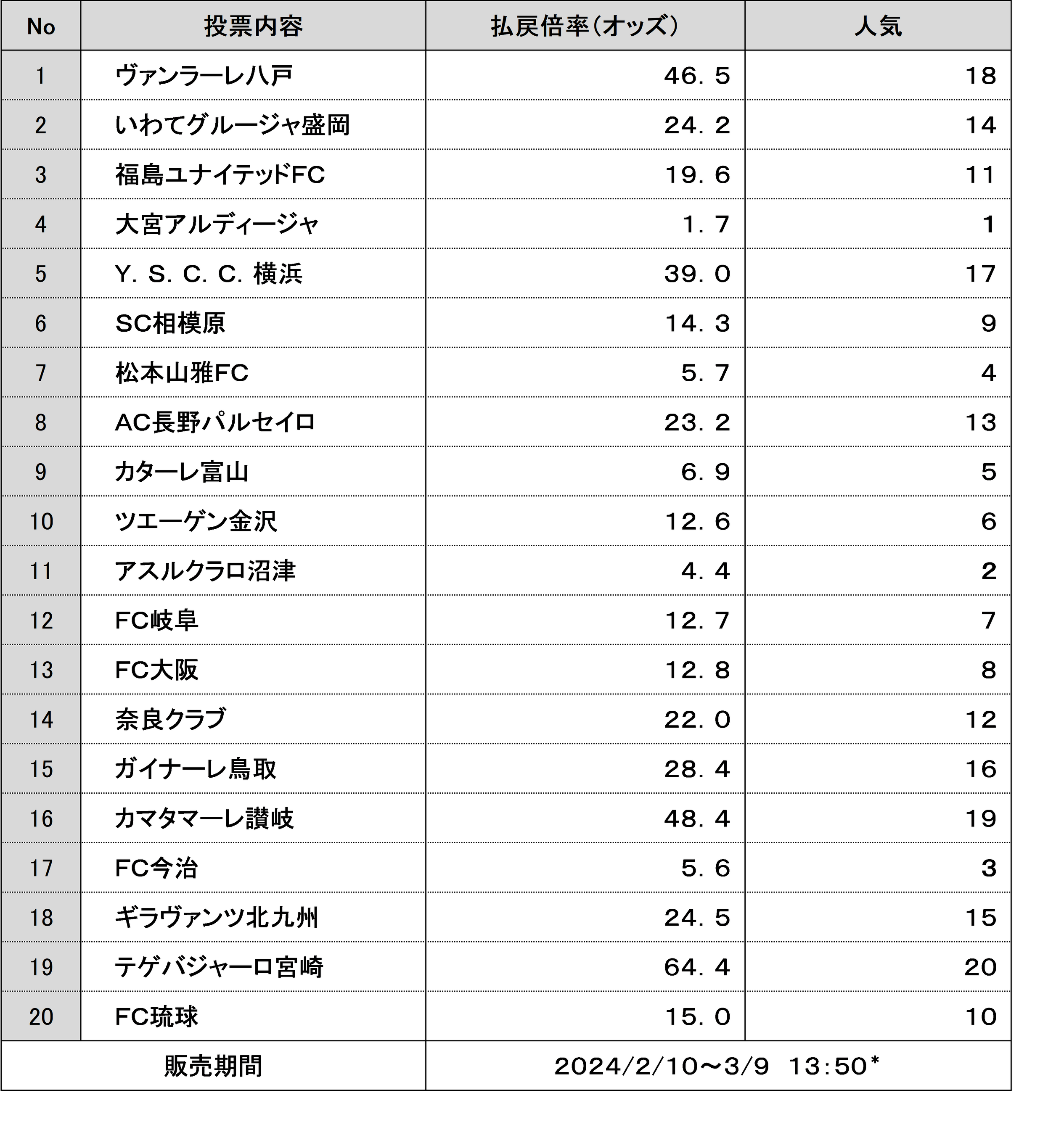 1番人気は、1年でのJ2復帰を目指す大宮アルディージャで、払戻倍率(オッズ)は1.7倍!2番人気は、昨シーズン13位のアスルクラロ沼津で、払戻倍率(オッズ)は4.4倍、3番人気は、昨シーズン4位のFC今治で、払戻倍率(オッズ)は5.6倍となっています。