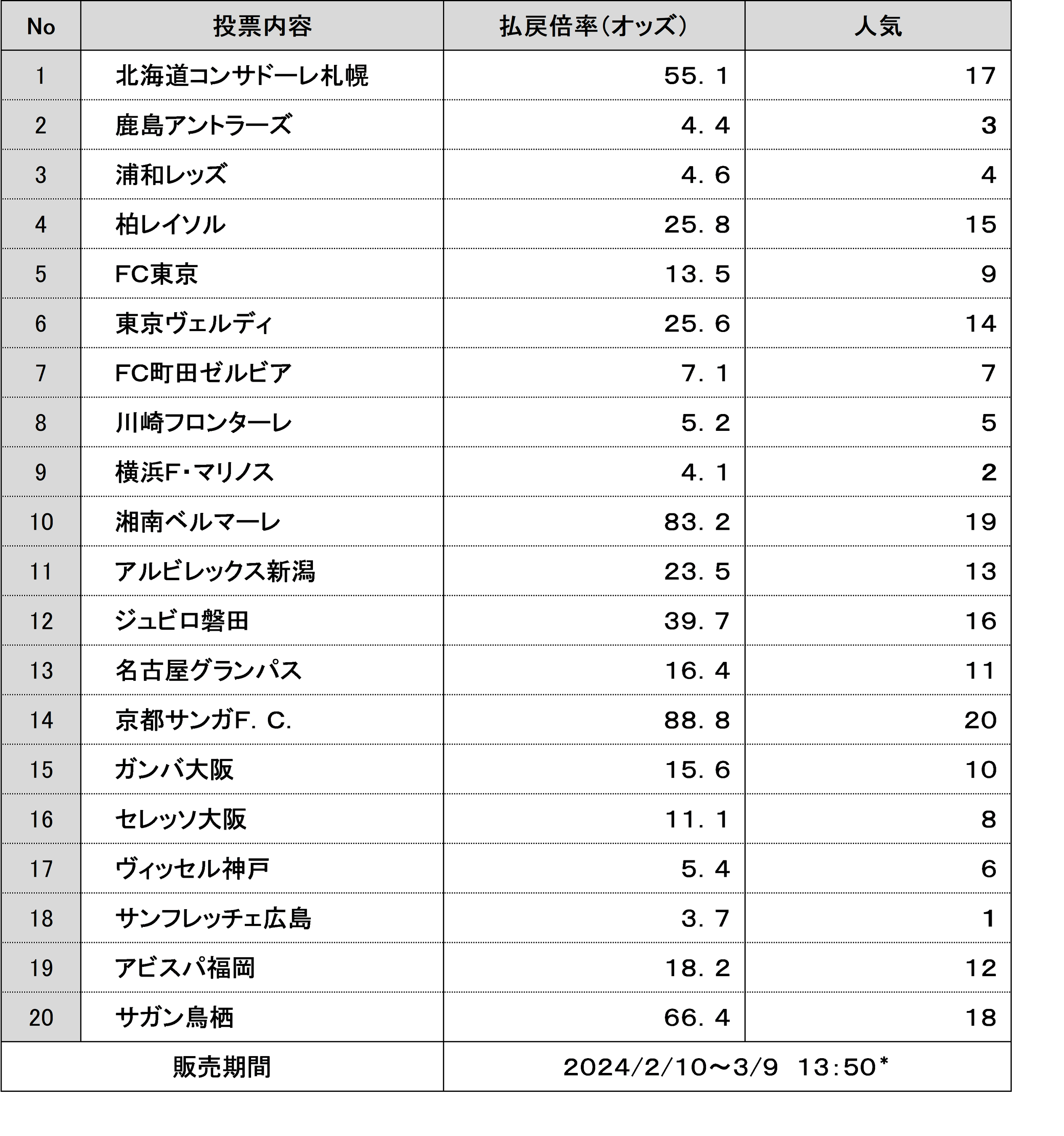 1番人気は、昨シーズン3位のサンフレッチェ広島で、払戻倍率(オッズ)は3.7倍!2番人気は、昨シーズン2位の横浜F・マリノスで、払戻倍率(オッズ)は4.1倍、3番人気は、昨シーズン5位の鹿島アントラーズで、払戻倍率(オッズ)は4.4倍となっています。