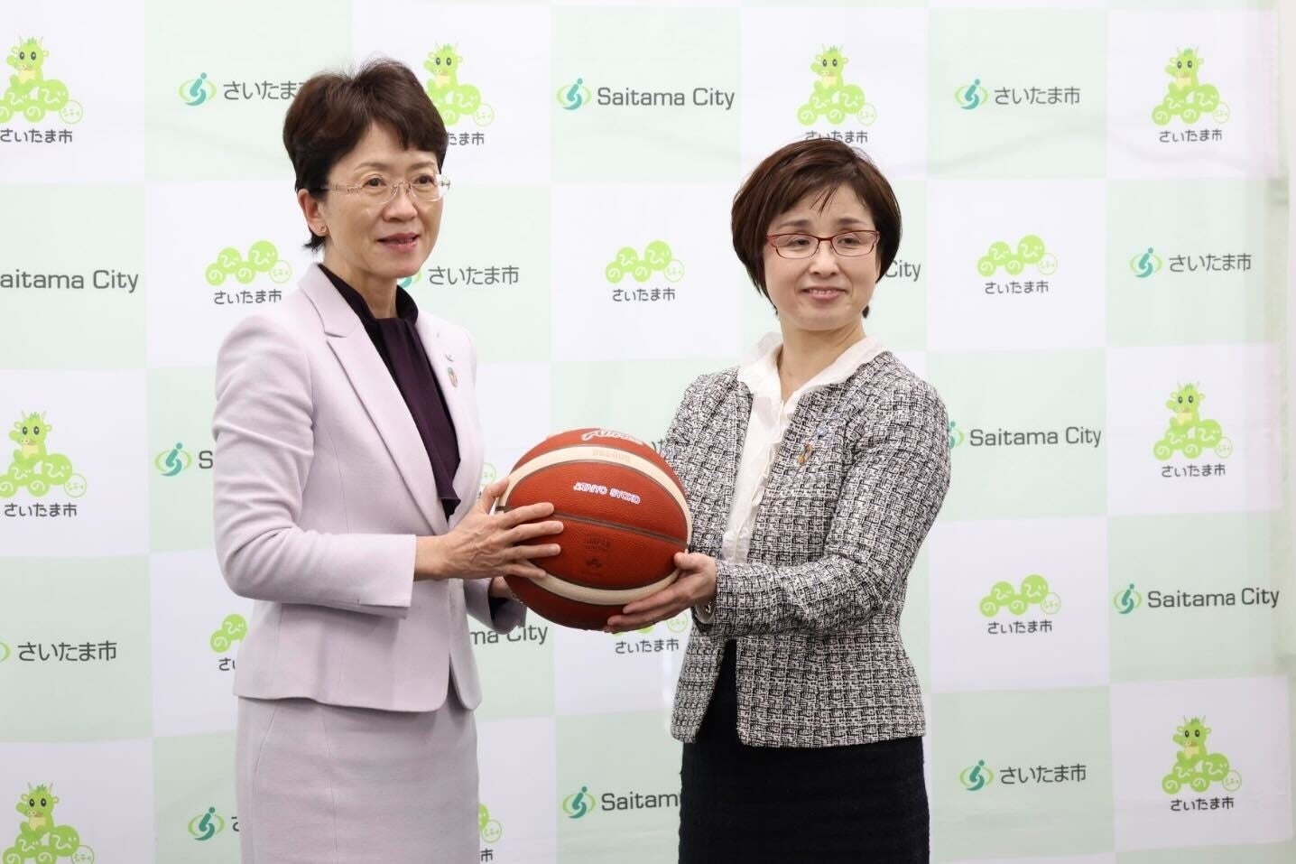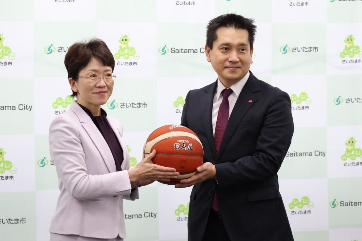 さいたま市役所で行われた寄贈式では、ご協賛をいただいたパートナー企業各社代表の皆様から、さいたま市教育長の竹居秀子様にバスケットボールをお渡し頂きました。