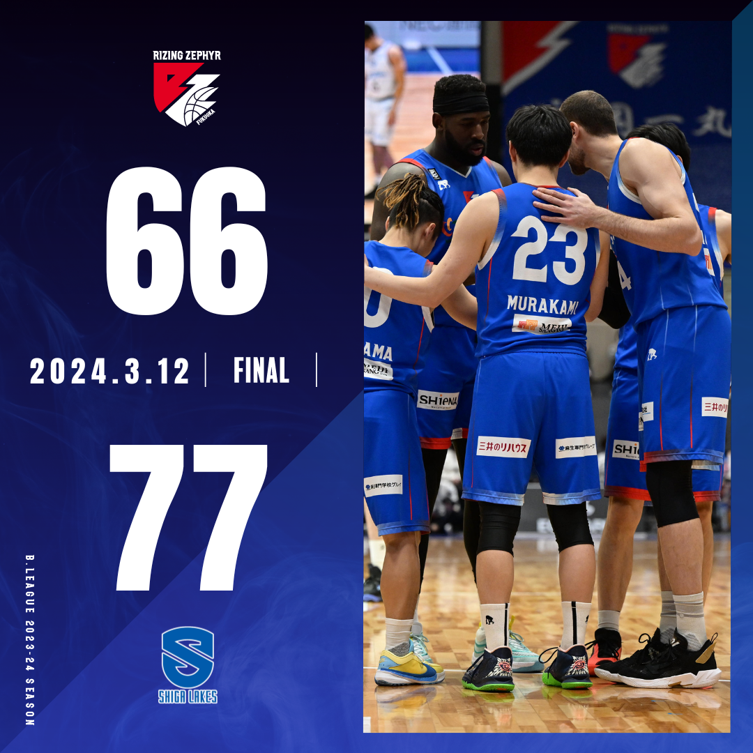 2024年3月12日(火)に開催されました【ライジングゼファーフクオカvs.滋賀レイクス】において“福岡66-77滋賀”の結果となりましたことお知らせいたします。